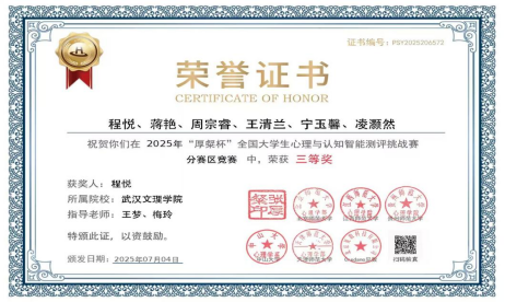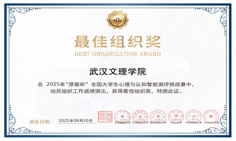 我校队伍与北京大学、北京师范大学、浙江大学、复旦大学、华中师范大学等高校同台竞技,最终在各个队伍中脱颖而出,共斩获三个区级及区级以上的奖项,展现了武汉文理学院在心理学与智能测评交叉领域的卓越实力。