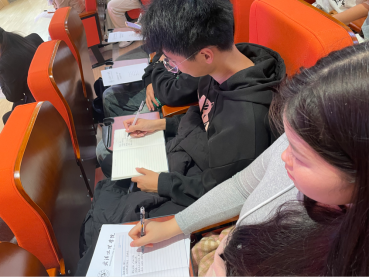 在听课过程中,同学们全神贯注,认真记录。笔尖在纸端飞快舞动,不仅记下了教学要点,更记下了对教育艺术的感悟与思考。刘老师的跨学科整合智慧、肖老师的情境创设巧思,以及那些充满温度的教育细节,都被一一细致记录。这一笔一划间,流露的是同学们对教育事业的热爱与执着追求。