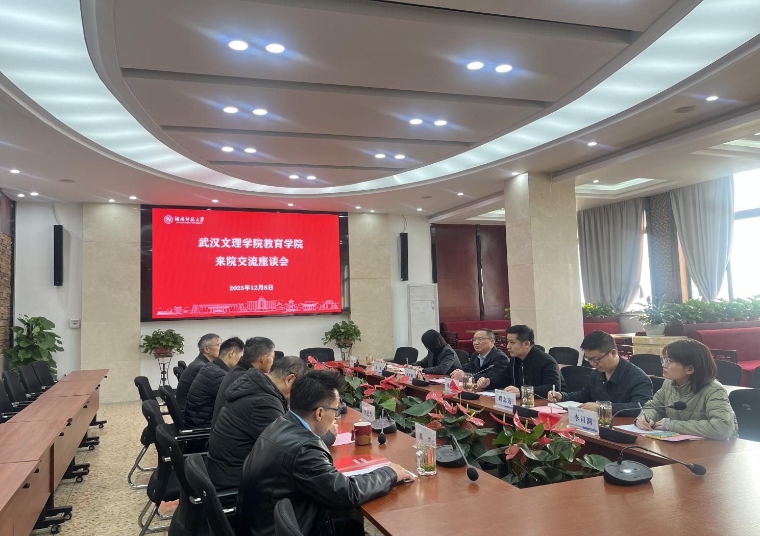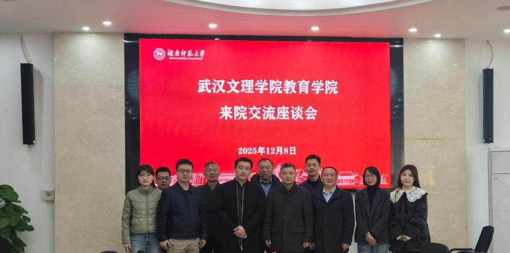 2025年12月8日上午,武汉文理学院教育学院副院长戴戈副教授一行7人赴湖南师范大学教育科学学院进行交流访问。湖南师范大学教育科学学院院长刘铁芳教授、教育学系主任叶波教授、刘德华教授、王卫华教授及学院信息化办公室主任邓勇老师出席座谈交流。