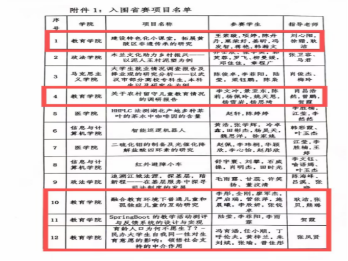 目前湖北省“挑战杯”校赛已全部结束,在各项目指导老师及各位参赛队员前期辛苦付出下,我院共有5个项目被推荐进入省赛,9个项目在校赛中获奖,教育学院获得了活动“优秀组织奖”的荣誉,收获颇丰。